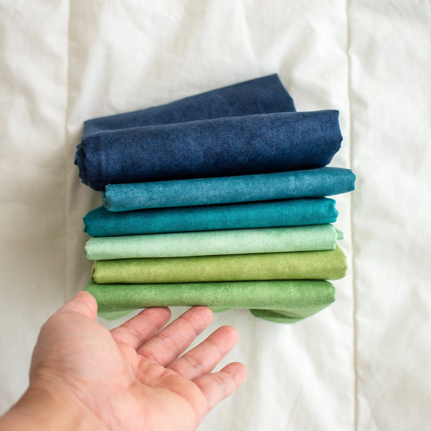 One of the reasons I chose this fabric collection for my quilt sample is because it offers a wide palette of colors: 168 to be exact. The pattern is great for blenders and solids so I had a lot of color combos in mind. Since I was eager to continue to try something new and different with this project, I chose shades of chartreuse and teal blues.