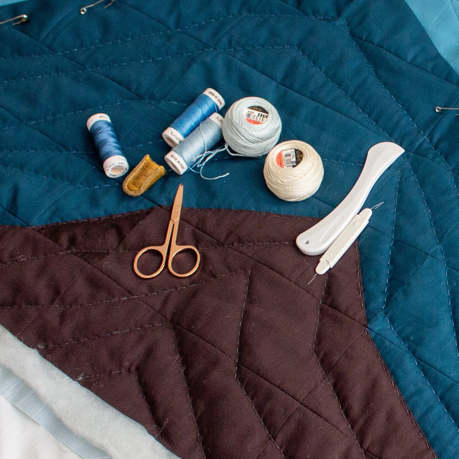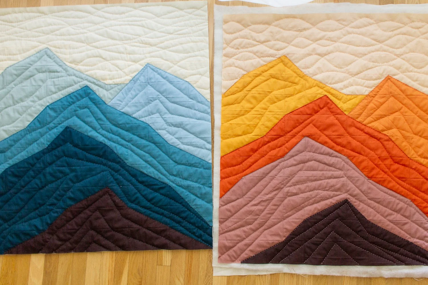 There was a time when I wasn’t a fan of hand quilting or binding. These days, they’re what I look forward to the most. I just love getting lost in the process. The only quilt designs I had in mind were making geometric angles to reflect the ruggedness of the mountains and wavy lines to emphasize the breeze. I marked my stitches using a Hera marker and mostly freestyled the stitches for the sky. I didn’t even realize how curvy my wavy lines were in the Sunrise version (warm colors) until the very end.